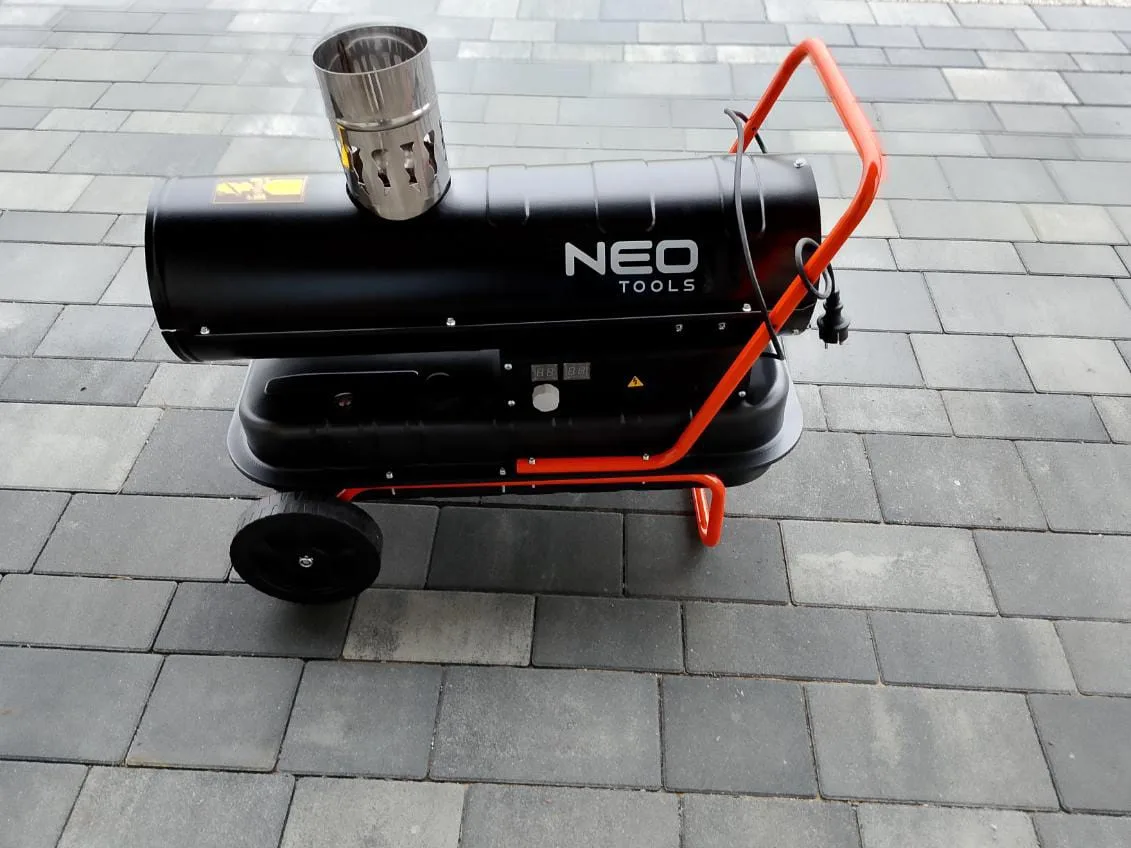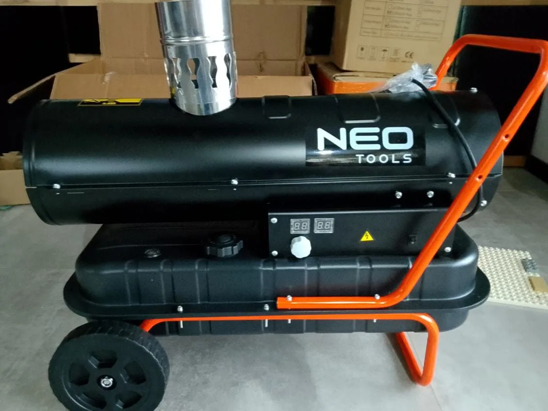 Nagrzewnica olejowa NEO Tools 20 kW do szybkiego dogrzewania hal, warsztatów i placów budowy. Komin odprowadza spaliny na zewnątrz, a higrostat ułatwia kontrolę warunków.